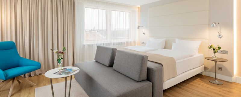 In the heart of the Eimsbüttel neighborhood and minutes from Hamburg’s city center, sits the NH Hamburg Mitte hotel, completely renovated in 2017. Formerly known as NH Hamburg Norge, this hotel is fantastic for both leisure and business travelers. Guests can walk to the Zoologisches Museum Hamburg, the Reeperbahn, the swimming pool at Kaifu-Bad, the Fish Market, and the Hamburger Dom. Situated just steps away from the Christuskirche and Schlump subway stations, the hotel provides easy access to Hamburg’s city center, central train station, and other sites. NH Hamburg Mitte has 134 inviting and modern rooms. NH Sleep Better mattresses, Sky TV and free Wi-Fi greet each guest. For recreation and additional sightseeing opportunities, the hotel offers bike rental 24 hours a day. For breakfast, guests can enjoy the extensive buffet which includes fresh juices, pastries, meats, cheeses, fruit, yogurt, and made-to-order hot dishes. What the hotel lacks in on-site lunch and dinner options, it makes up for with its proximity to the bohemian Schanzenviertel district, home to trendy restaurants and thriving nightlife. The NH Hamburg Mitte’s lobby bar is perfect for pre- or post-dinner drinks and snacks, and it's open 24/7.