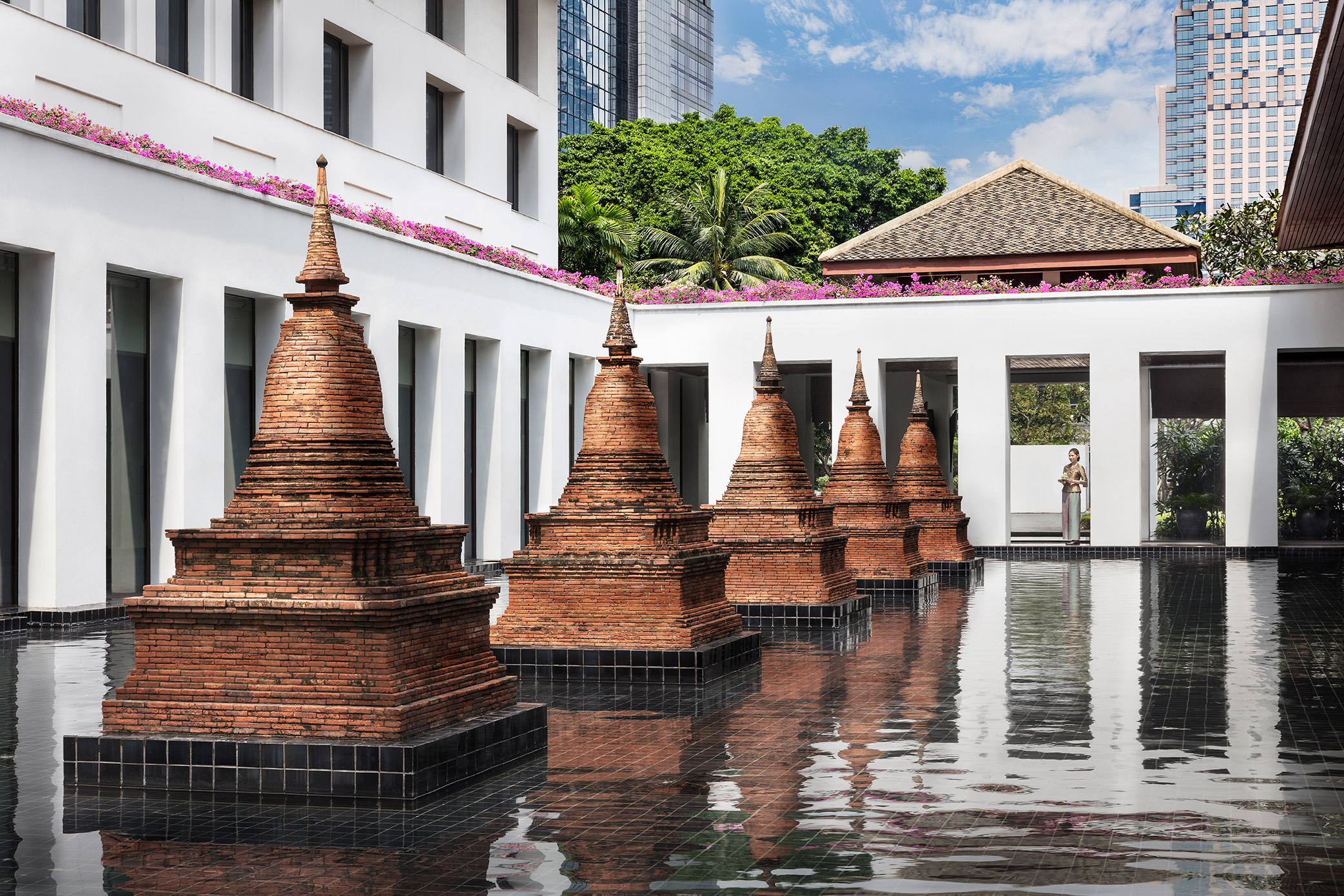 Behind the entrance, along Bangkok’s Financial District and Embassy Row, the tree-lined driveway and six acres of tropical flower gardens and lotus ponds recapture the serenity of Thailand’s golden age. The lobby’s courtyard pond reflects the surrounding replicas of 13th century Sukhothai stupas.